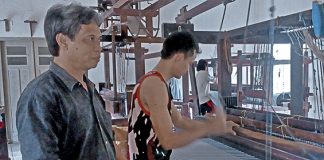Benang katun berwarna putih menjuntai di sela tiang-tiang kayu yang berdiri setinggi sekitar dua meter. Di salah satu sisi, seorang pekerja menjalankan sebuah mesin tenun di hadapannya dengan teliti. Di ruangan itu, benang yang masih kental beraroma kapas dirangkai satu persatu, membentuk lembaran kain. Beberapa saat berlalu, benang-benang