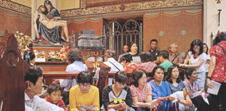 Misa masih dua jam lagi. Tapi umat sudah memenuhi gereja Katedral St Perawan Maria Diangkat Ke Surga Jakarta, sejak Pukul 15.00 WIB. Umat datang dari berbagai paroki untuk menghadiri peluncuran Rosario Merah Putih, Minggu 1/5. Rosario ini dibuat dari manik-manik berwarna merah dan putih sebagai salah satu penerapan Arah Dasar KAJ 2016 “mengamalkan Pancasilaâ€. Sebagian besar umat membawa Rosario Merah Putih. Panitia menyediakan dalam jumlah terbatas.
